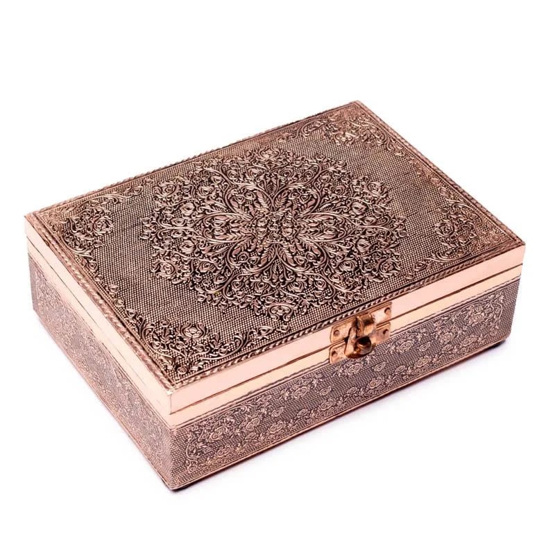 Mooie koperkleurige Tarot- Sieraden-doos van aluminium, met Mandala decoratie.