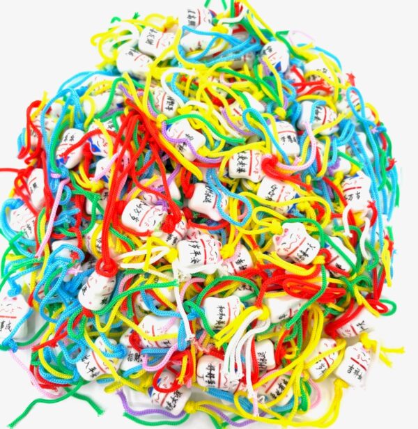 Leuk Gelukskatje, in verschillende kleuren aan een gekleurd koordje, als een gelukspopje.