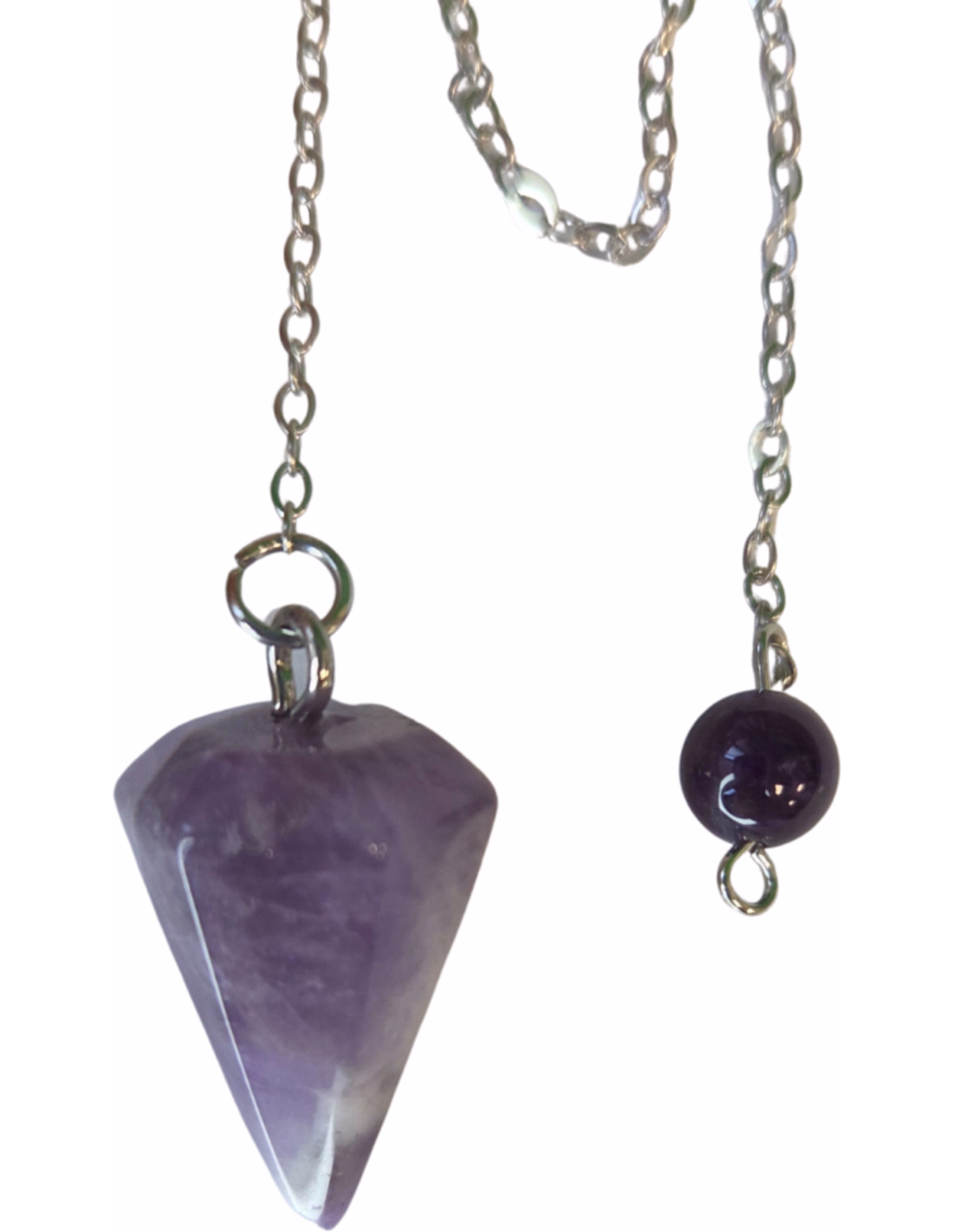 Mooi pendeltje van Amethist gefacetteerd in een pijlvorm, met een kraaltje van amethist aan het kettinkje.