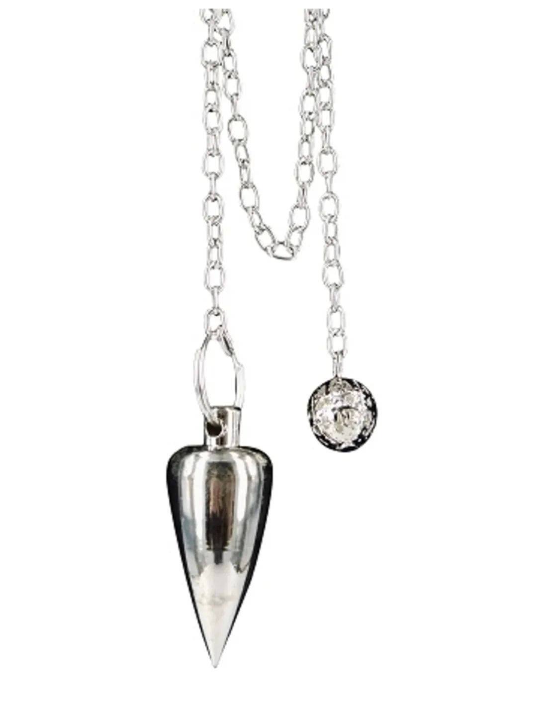 Mooi zilverkleurige pendeltje in een kegevorm , aan een kettinkje met zilverkleurige kraal.