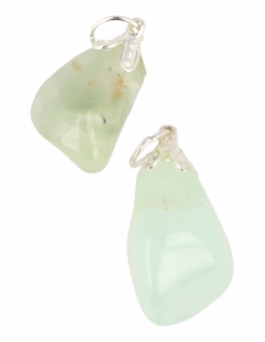 Prehniet hangertje, voor als sieraad aan een ketting of een koordje. Voor het oogje zijn sommige hangertjes ingeboord, anderen hebben een opgeplakt kapje als bevestiging.